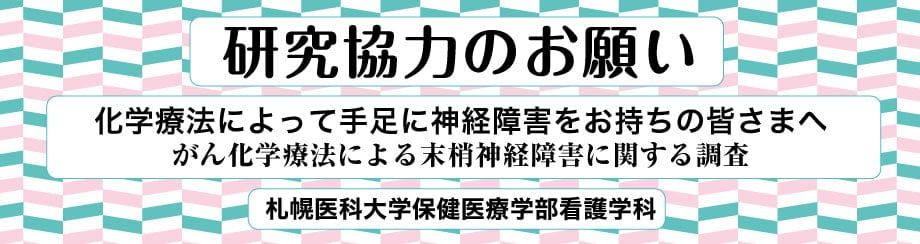 札幌医科大学保健医療学部看護学科では「混合研究法を用いた化学療法誘発性末梢神経障害患者の歩行支援に関する基礎研究」というテーマで研究を進めています。この研究では、化学療法によって手足にしぴれ・痛み・違和感などが生じた患者様にアンケートをお願いし、「社会活動の機会を保つこと」「生活の質を高めること」を目指しています。皆さまのこ協力を心よりお願い申し上げます。
